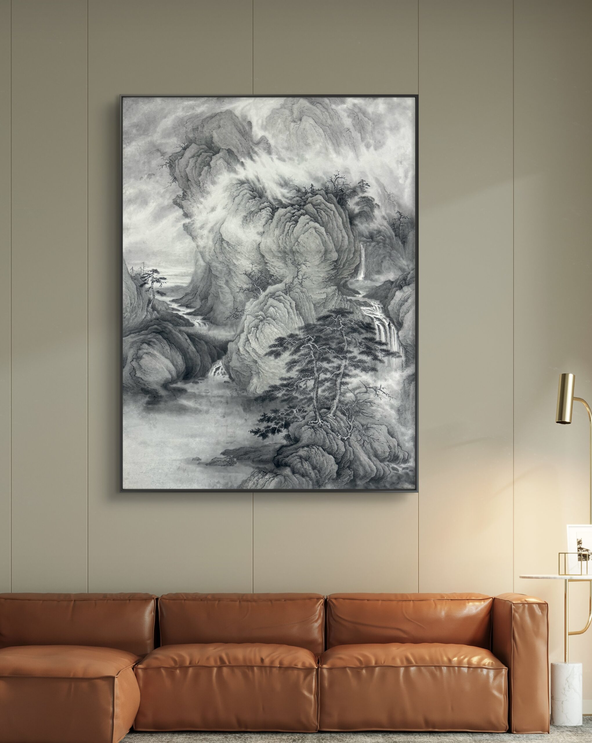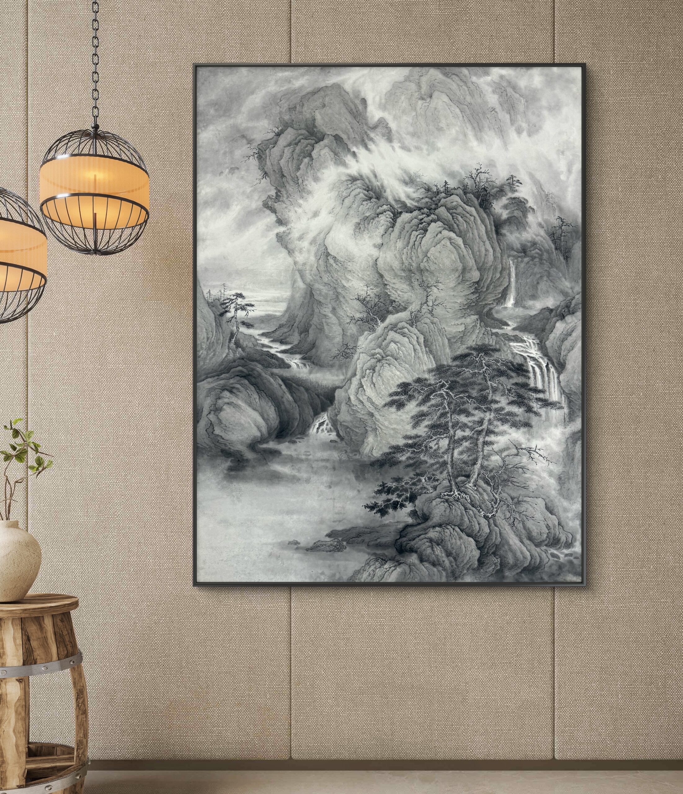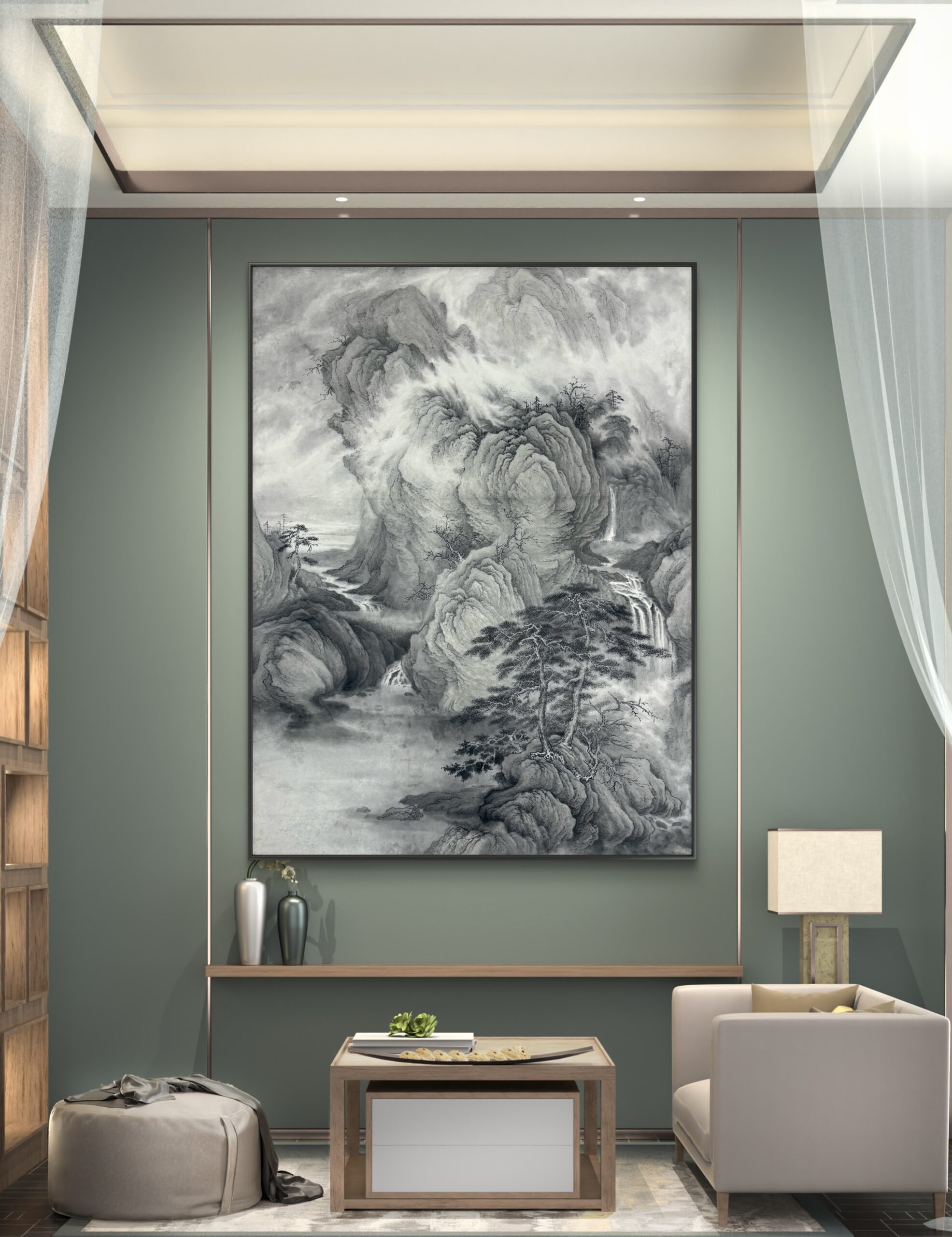 This large-scale vertical work serves as a magnificent statement piece for luxury residential foyers, grand living rooms, or high-end corporate offices. It offers a timeless aesthetic that bridges Eastern heritage and modern minimalism. Perfect for collectors of Fine Art Ink, Contemporary Chinese Art, and Zen-inspired landscapes.