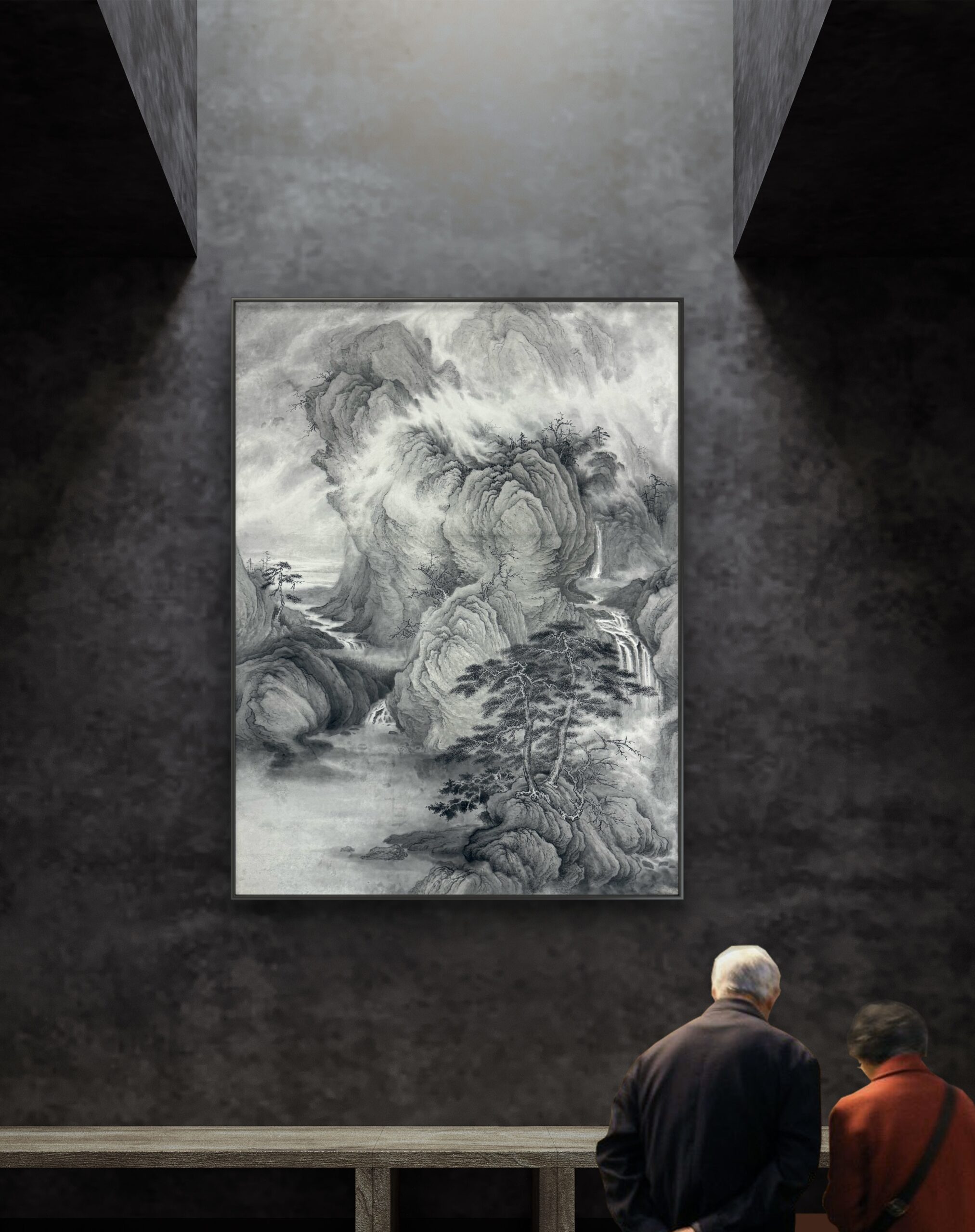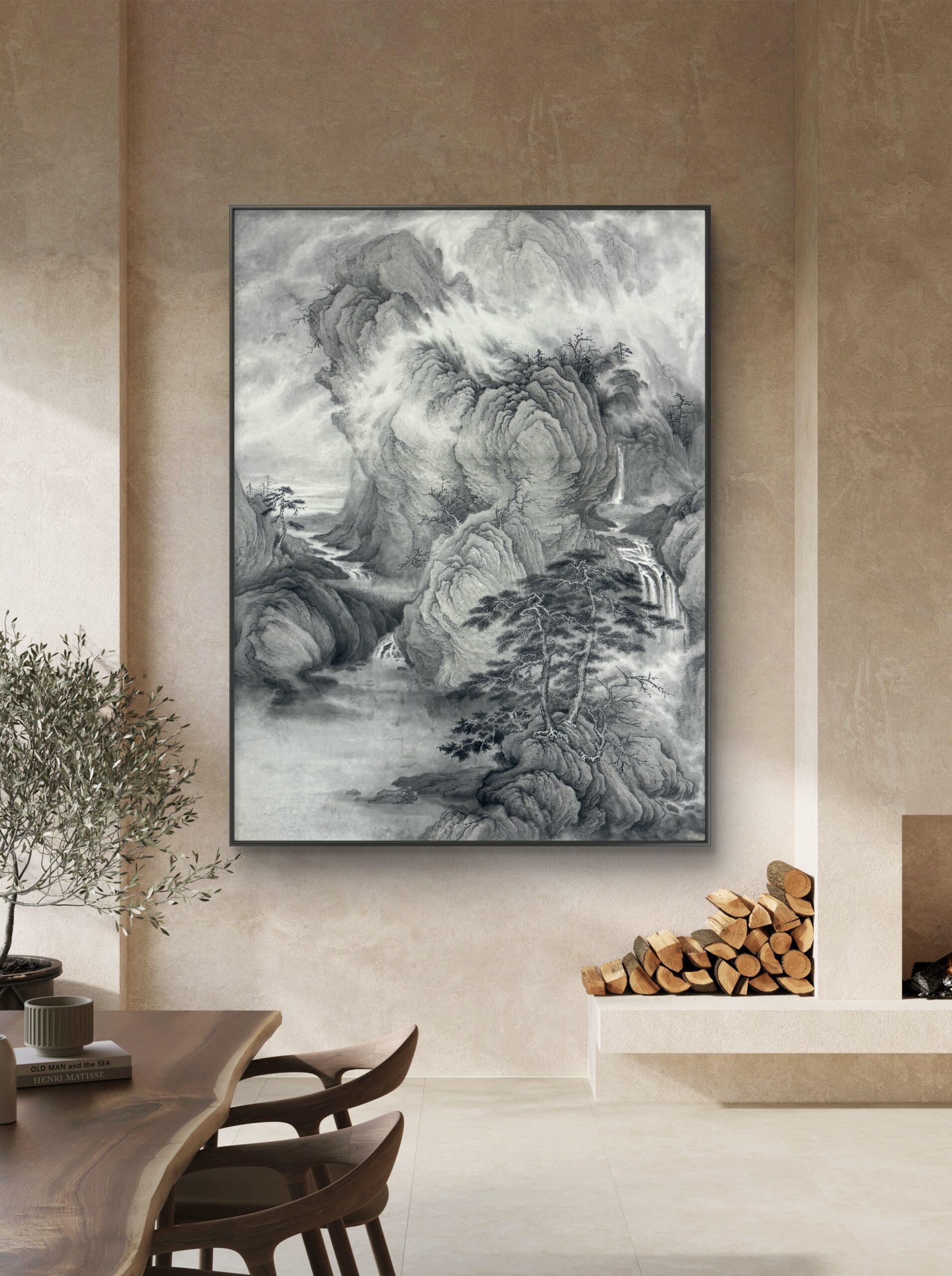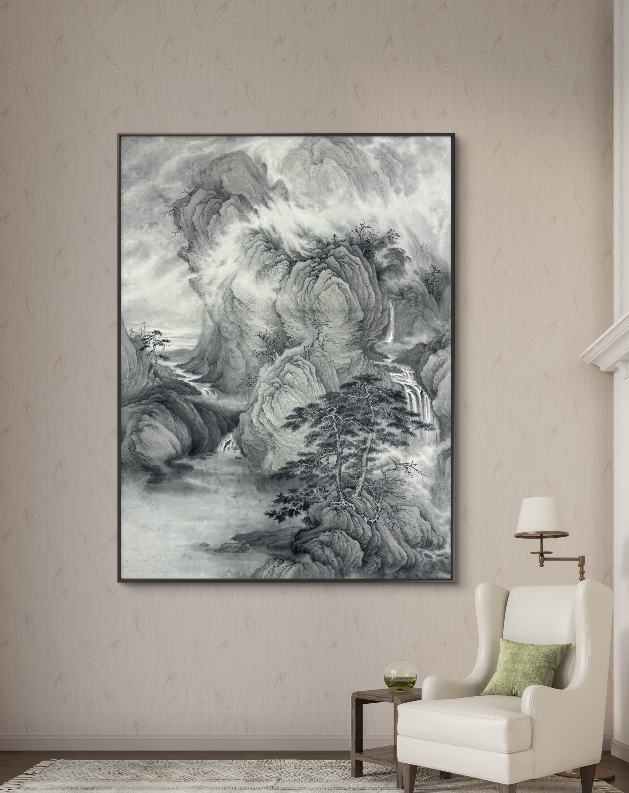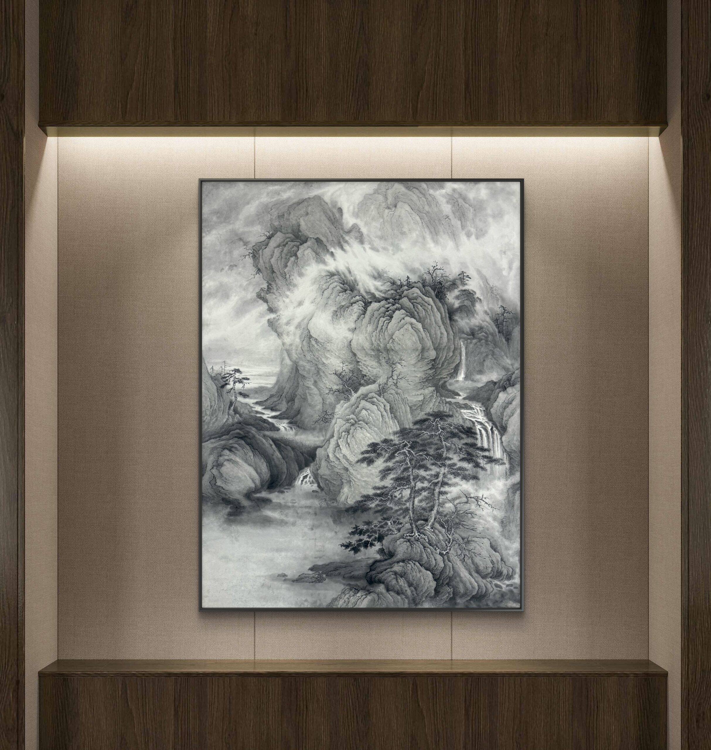 This large-scale vertical work serves as a magnificent statement piece for luxury residential foyers, grand living rooms, or high-end corporate offices. It offers a timeless aesthetic that bridges Eastern heritage and modern minimalism. Perfect for collectors of Fine Art Ink, Contemporary Chinese Art, and Zen-inspired landscapes.