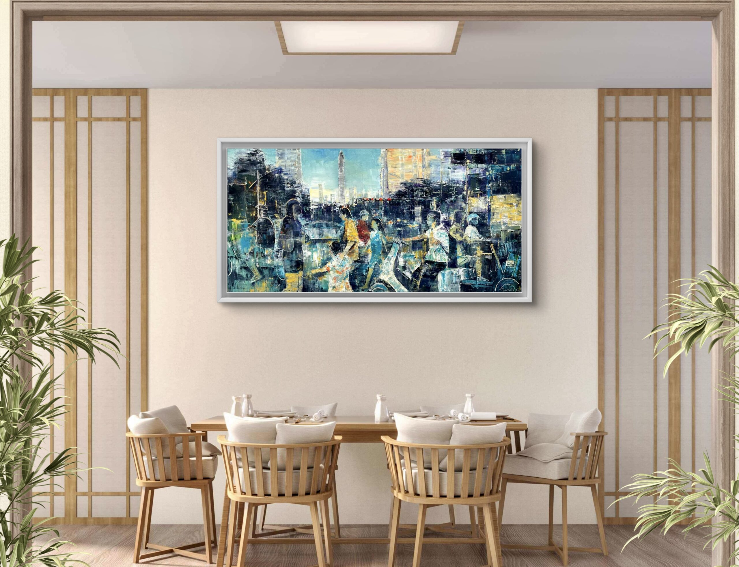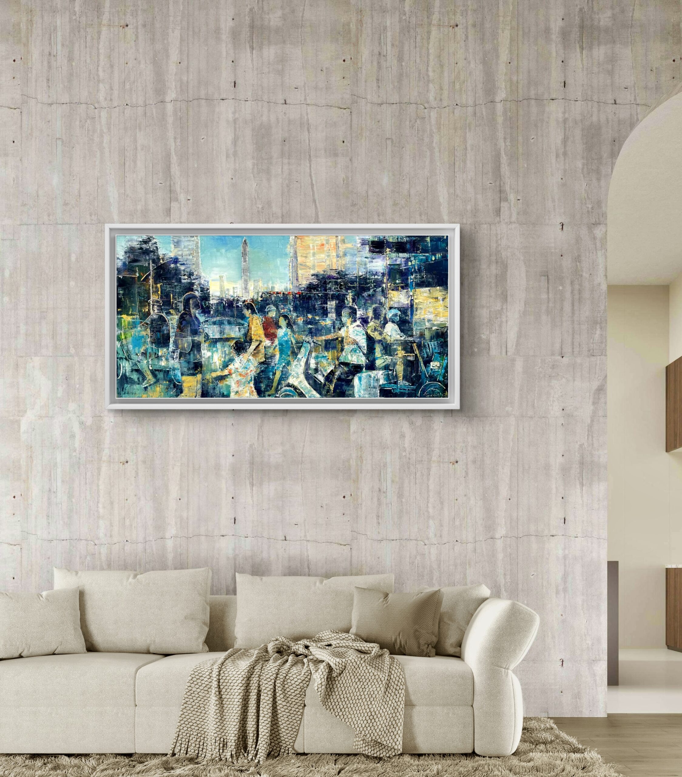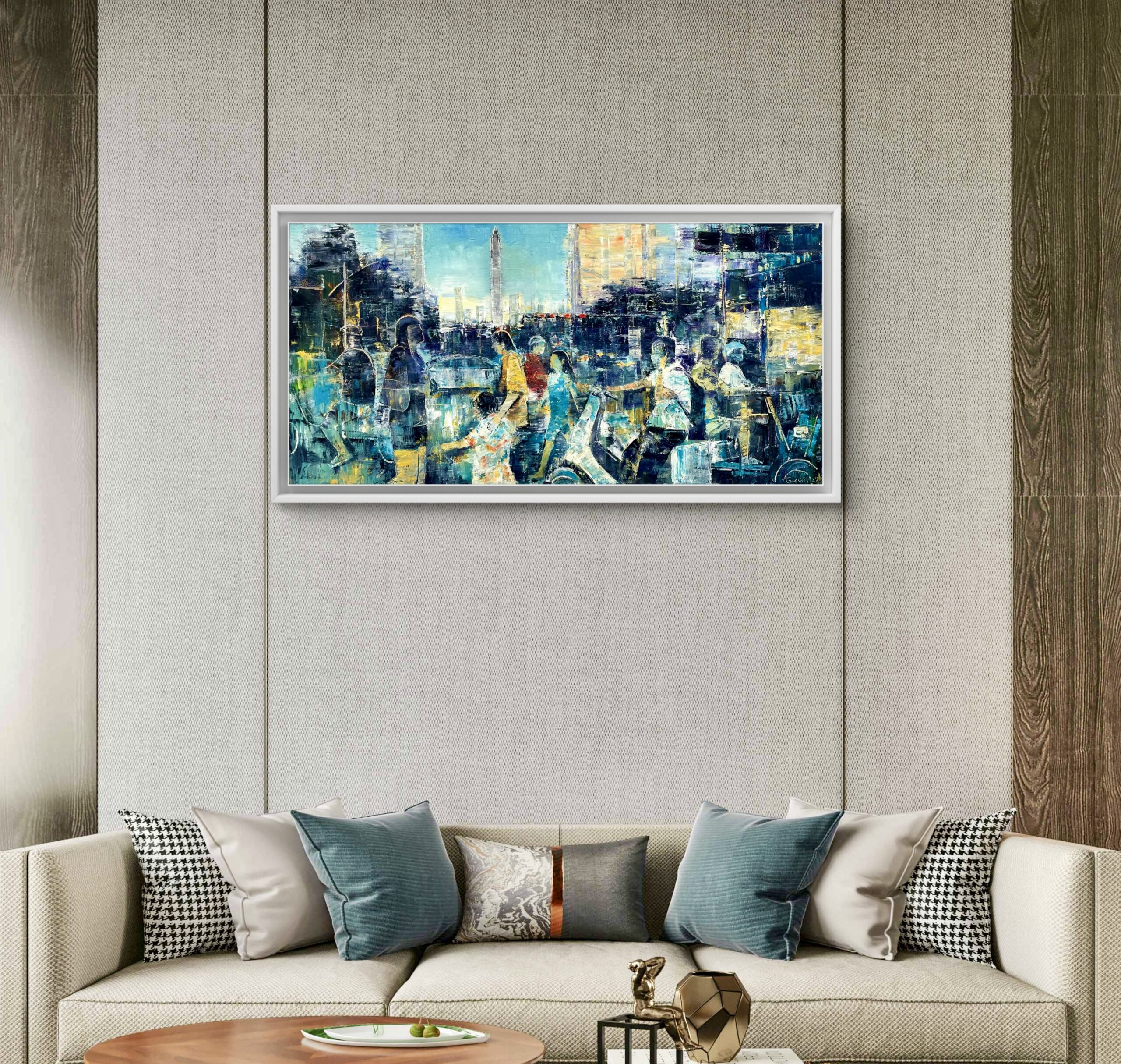 The soul of this painting is “movement.” Cyclists, pedestrians, a pause at a traffic light—countless instants are compressed into one frame. Vertical strokes build the cold high-rises, horizontal strokes cut across the streets, and diagonal, fragmented color blocks express the human surge. It’s the city’s rhythm: tense, fast, yet ordered.