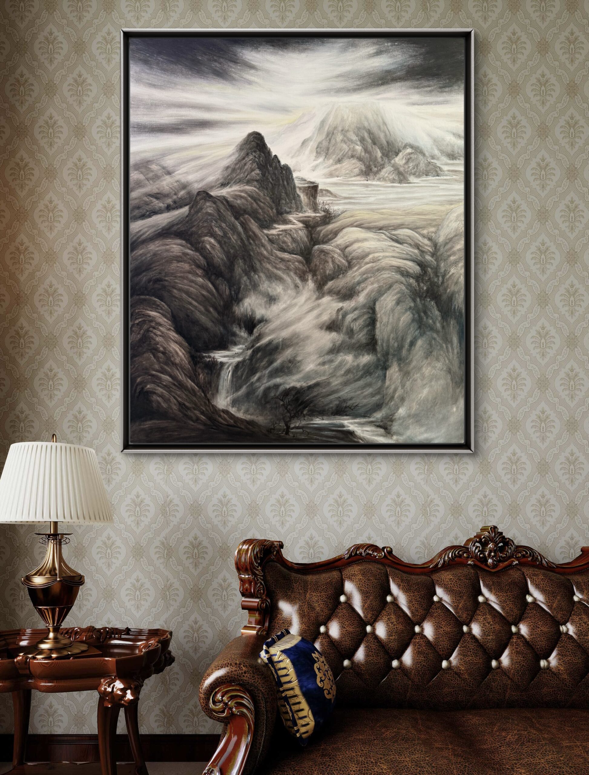 The composition features majestic, dark mountain ridges contrasted against an ethereal, light-filled sky. The subtle use of earth tones, greys, and luminous whites creates a sense of timelessness and vastness. A delicate waterfall and misty valleys add a layer of tranquility, inviting the viewer into a meditative state of wonder.