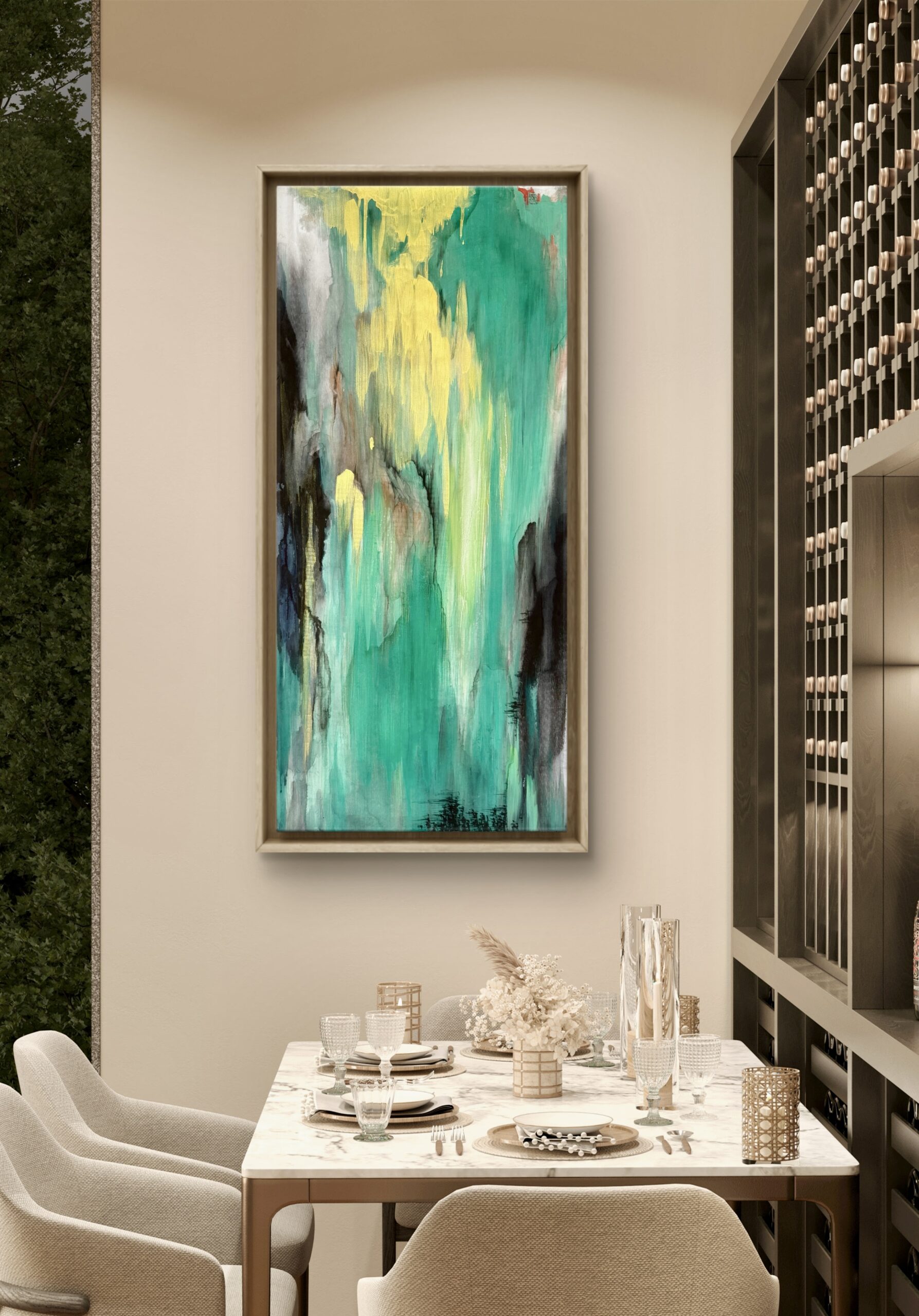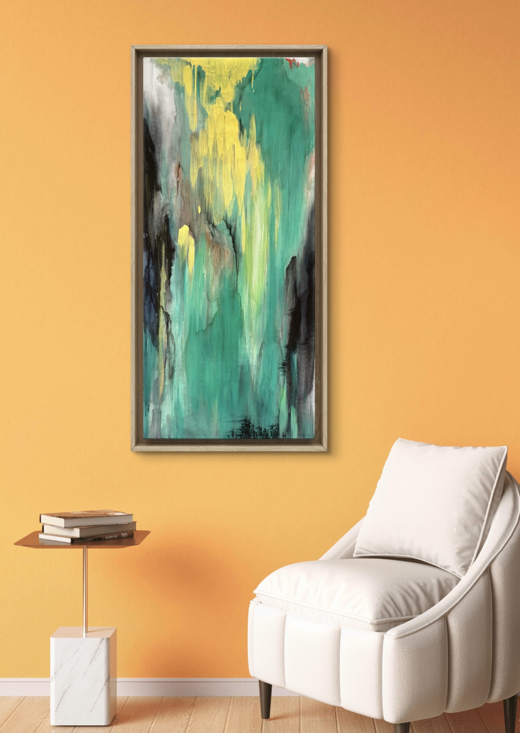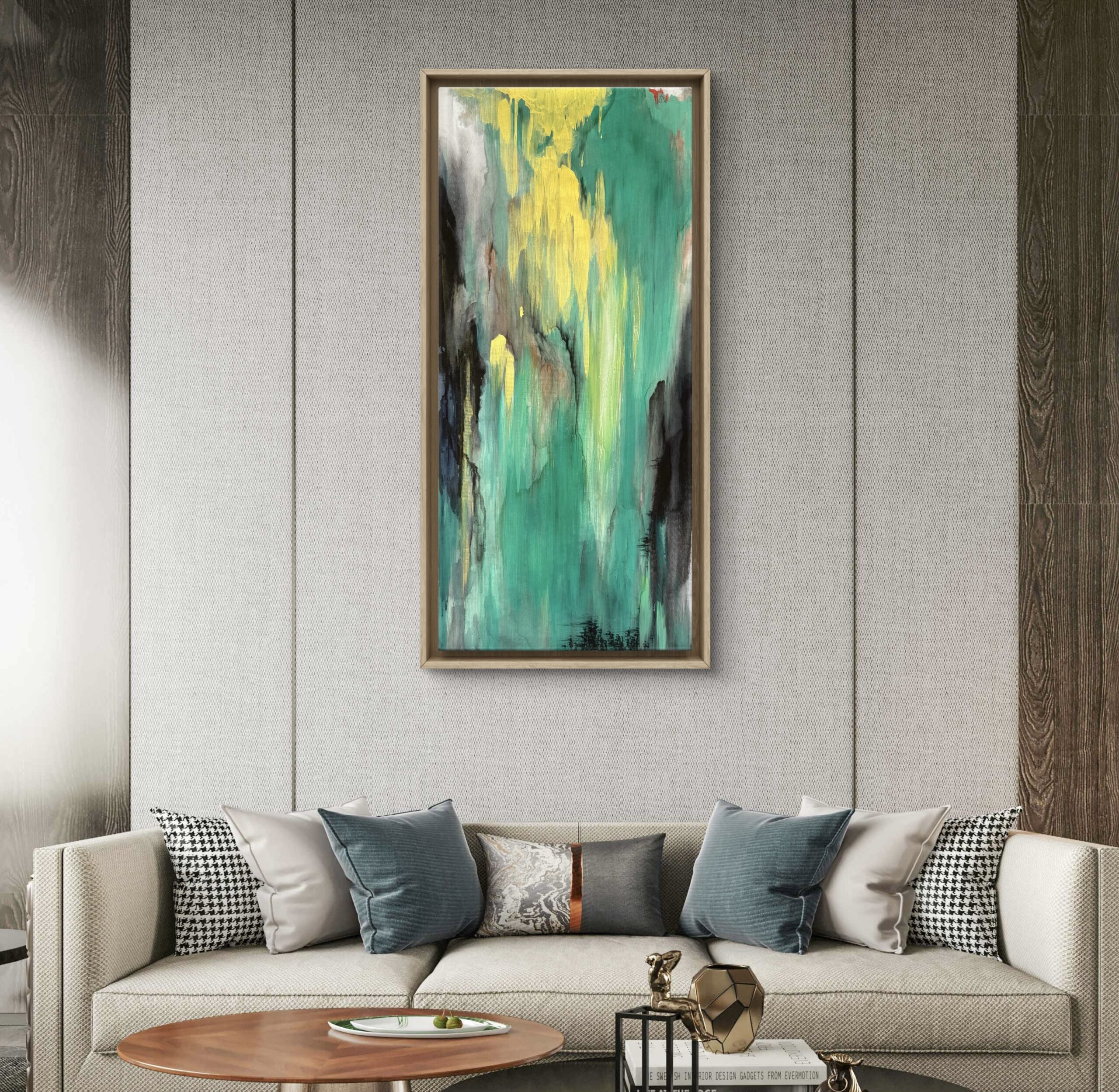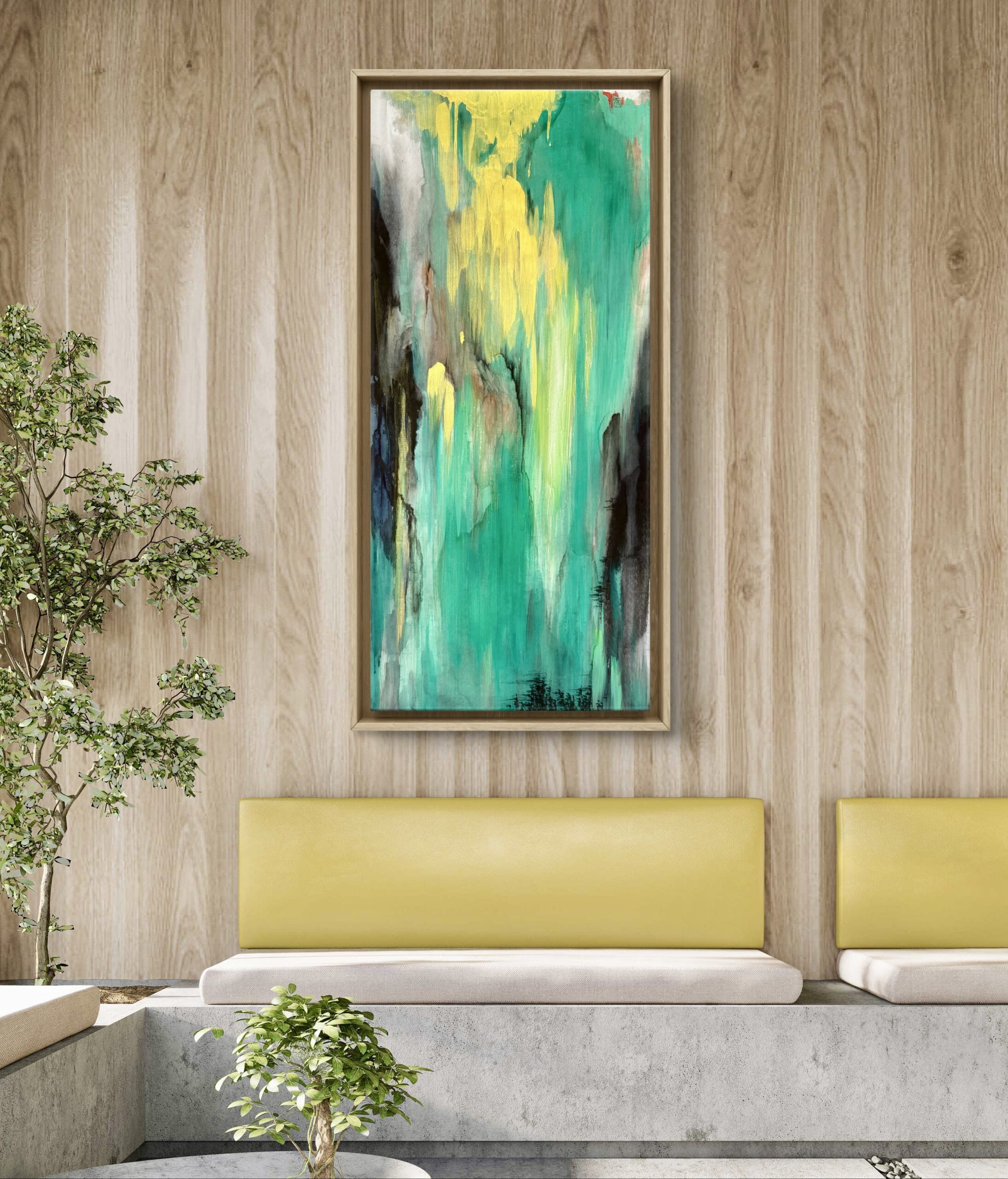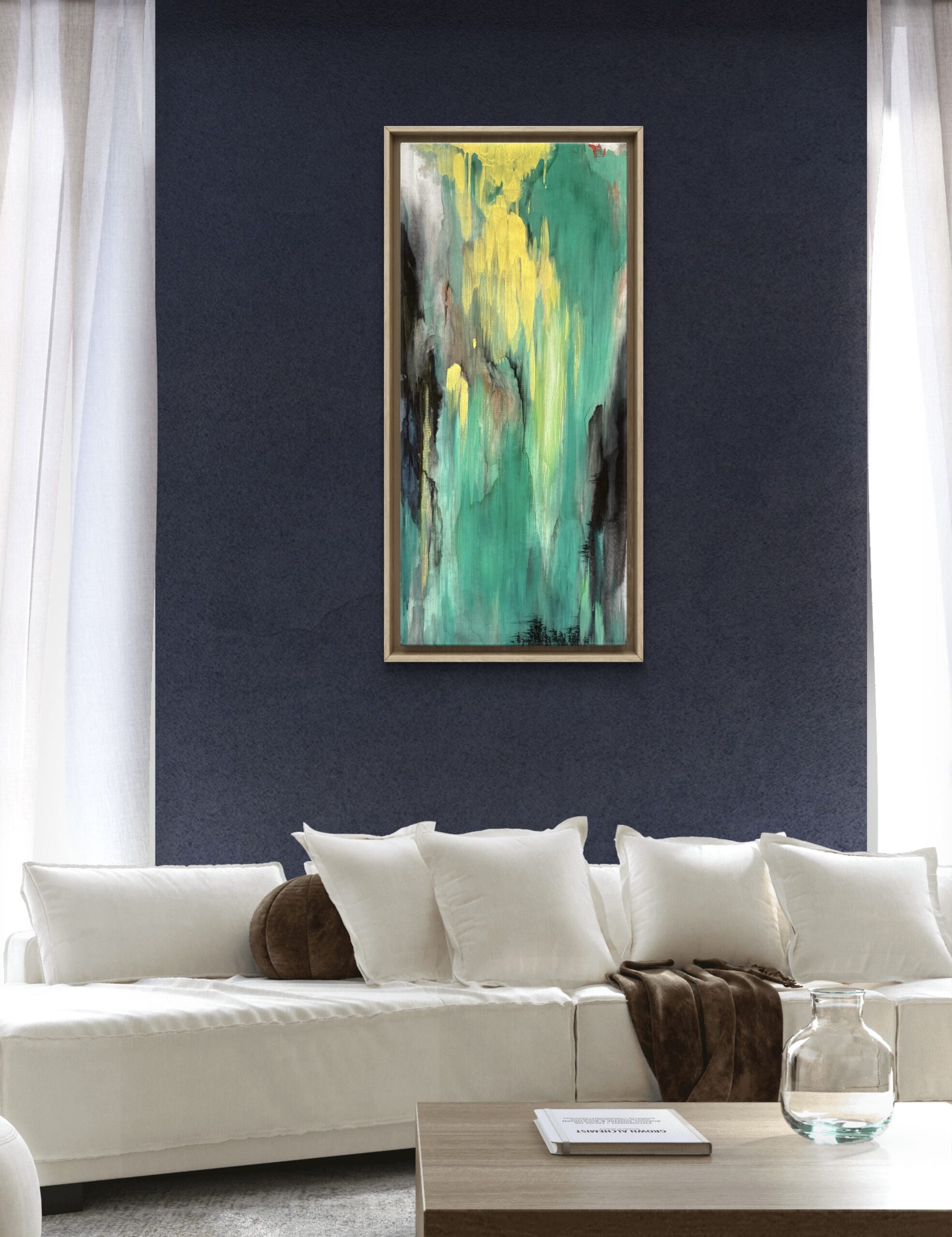 Vibrant Emerald Green flows vertically, evoking an untamed waterfall and life force. This dynamism is anchored by deep, silent Black Ink masses, symbolizing ancient, enduring cliffs—a nod to classical Shanshui structure. The focal point is the incandescent Metallic Gold element, a spiritual beacon symbolizing Hope, Enlightenment, and Qi. It acts as an internal light source piercing the depth.