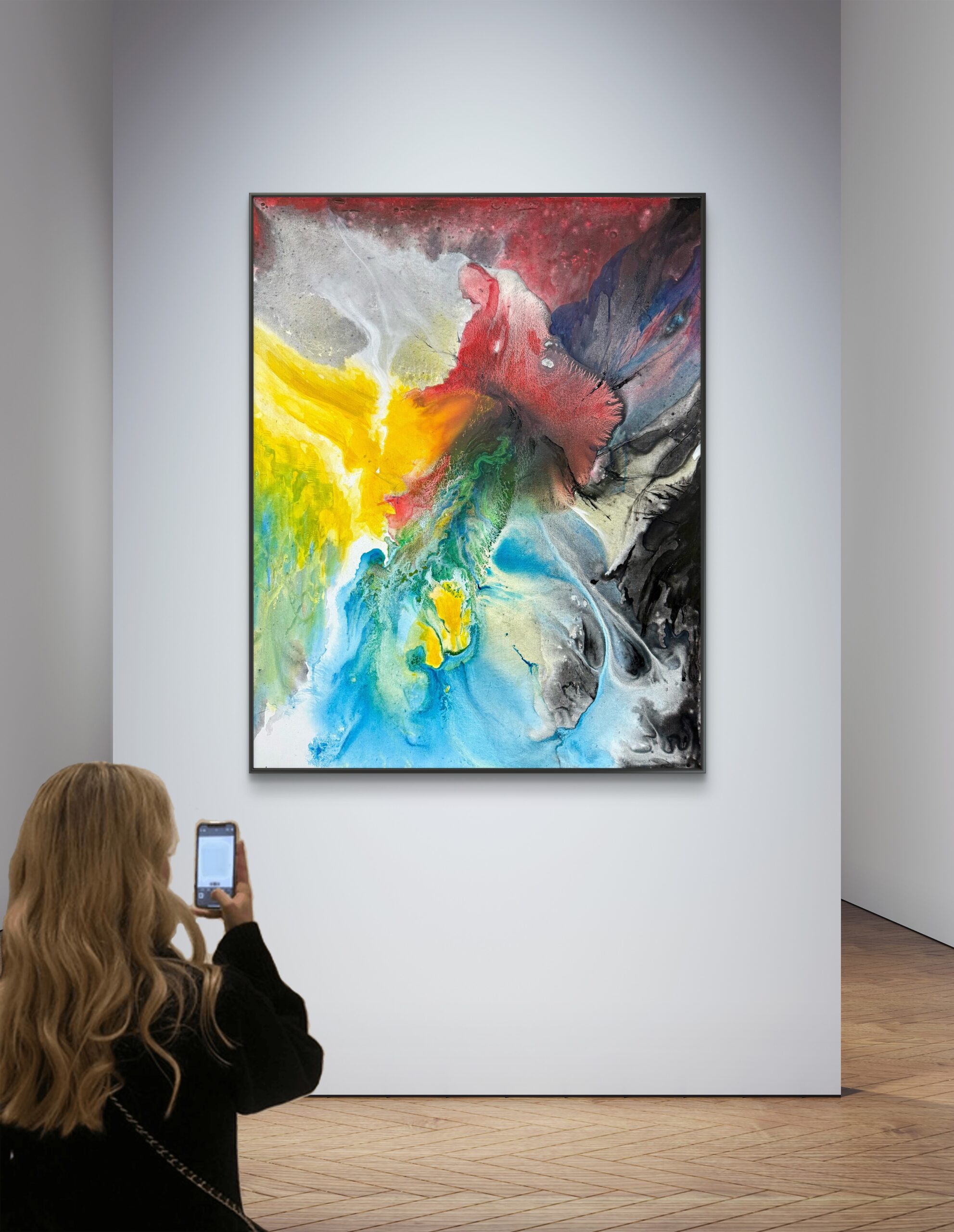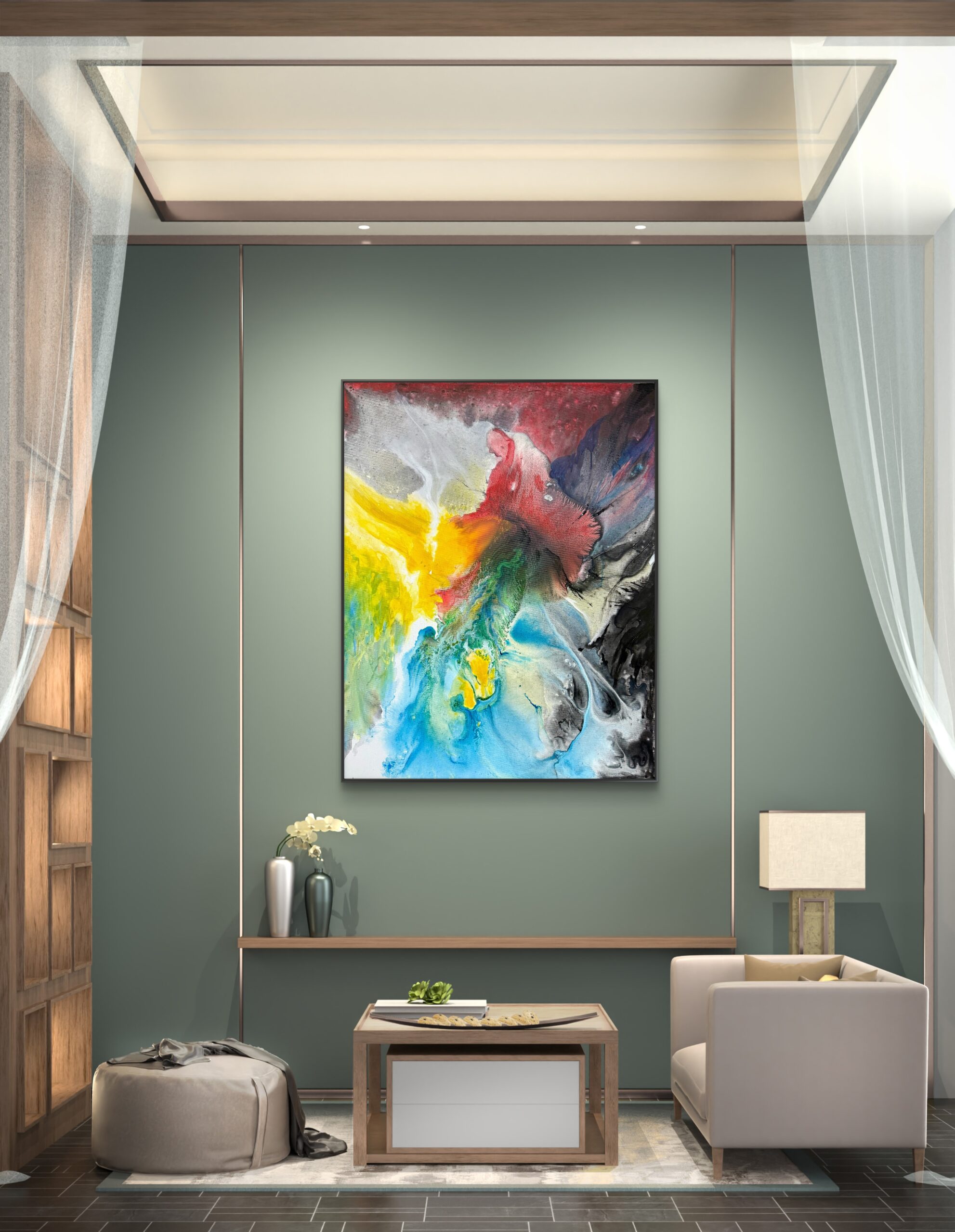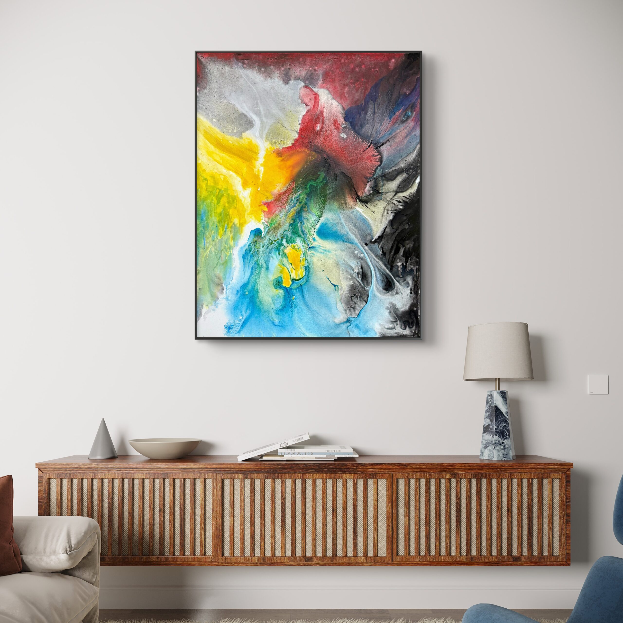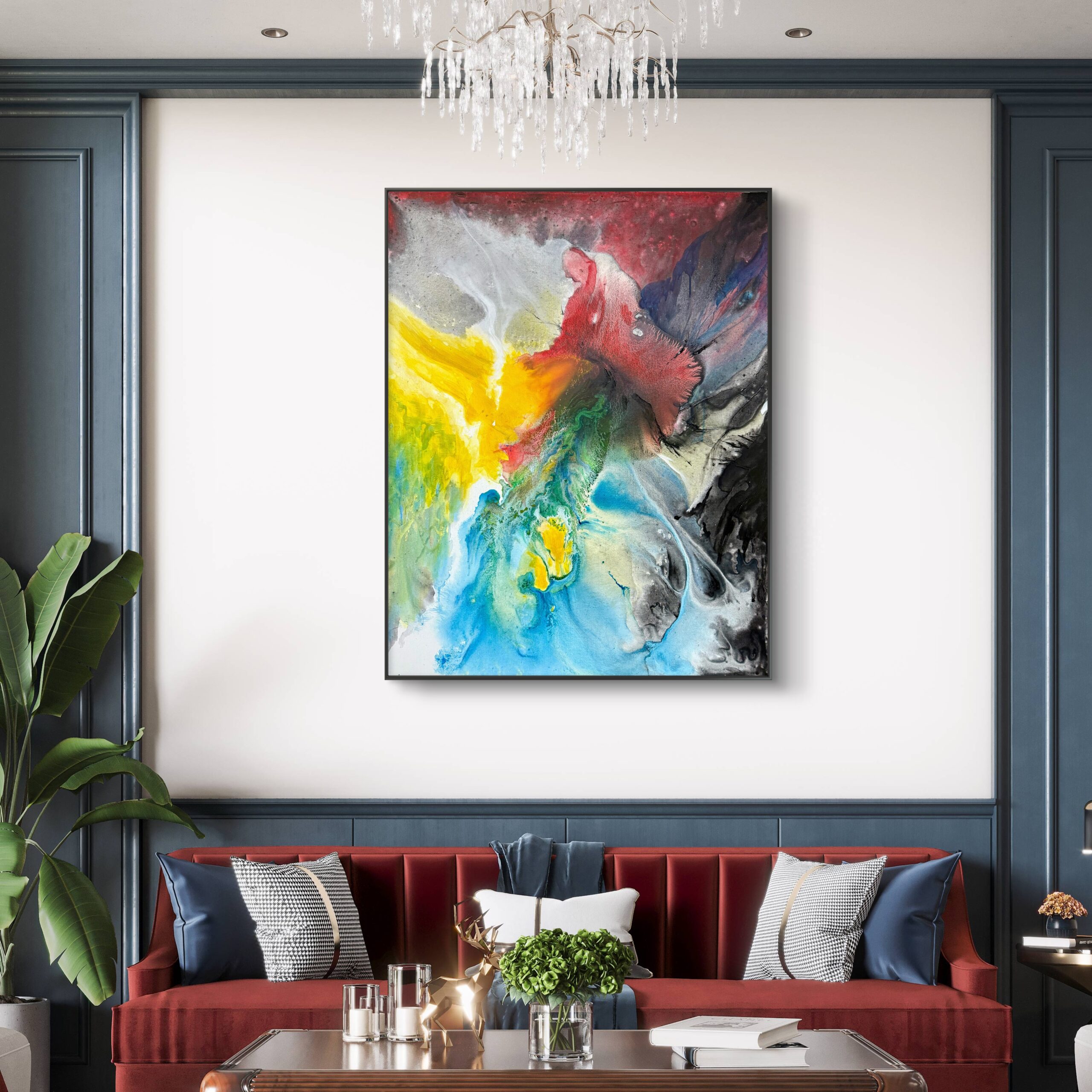 This striking piece (approx. 31.50 x 39.37 in) is a perfect focal point for a modern living room, a creative studio, or a contemporary office. It will instantly inject energy and color into any space. Appeals to collectors of Abstract Expressionism, Fluid Art, Contemporary Acrylic Painting, and Vibrant Color Art.
