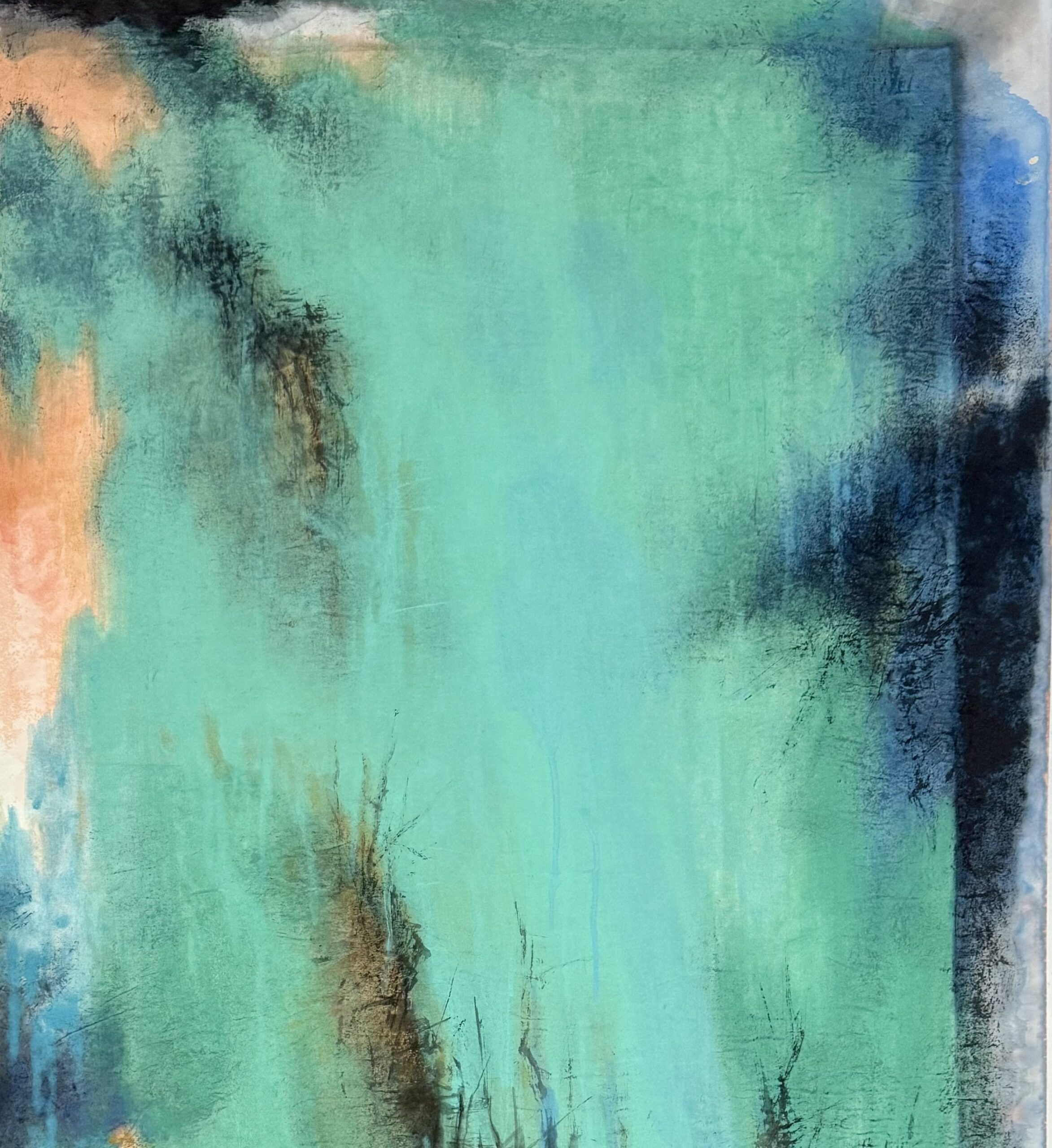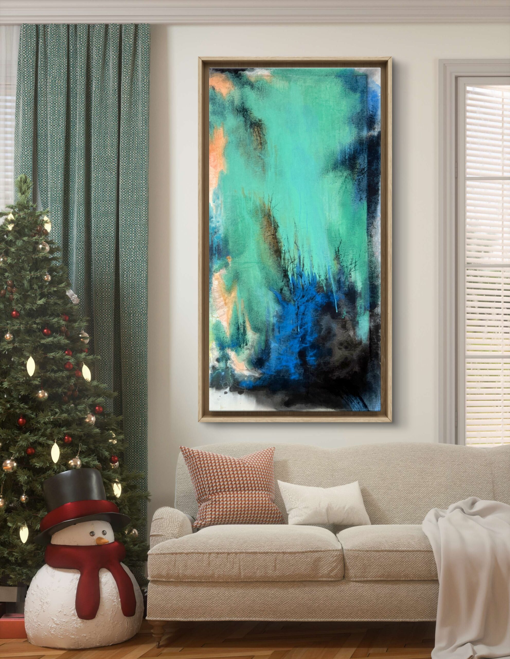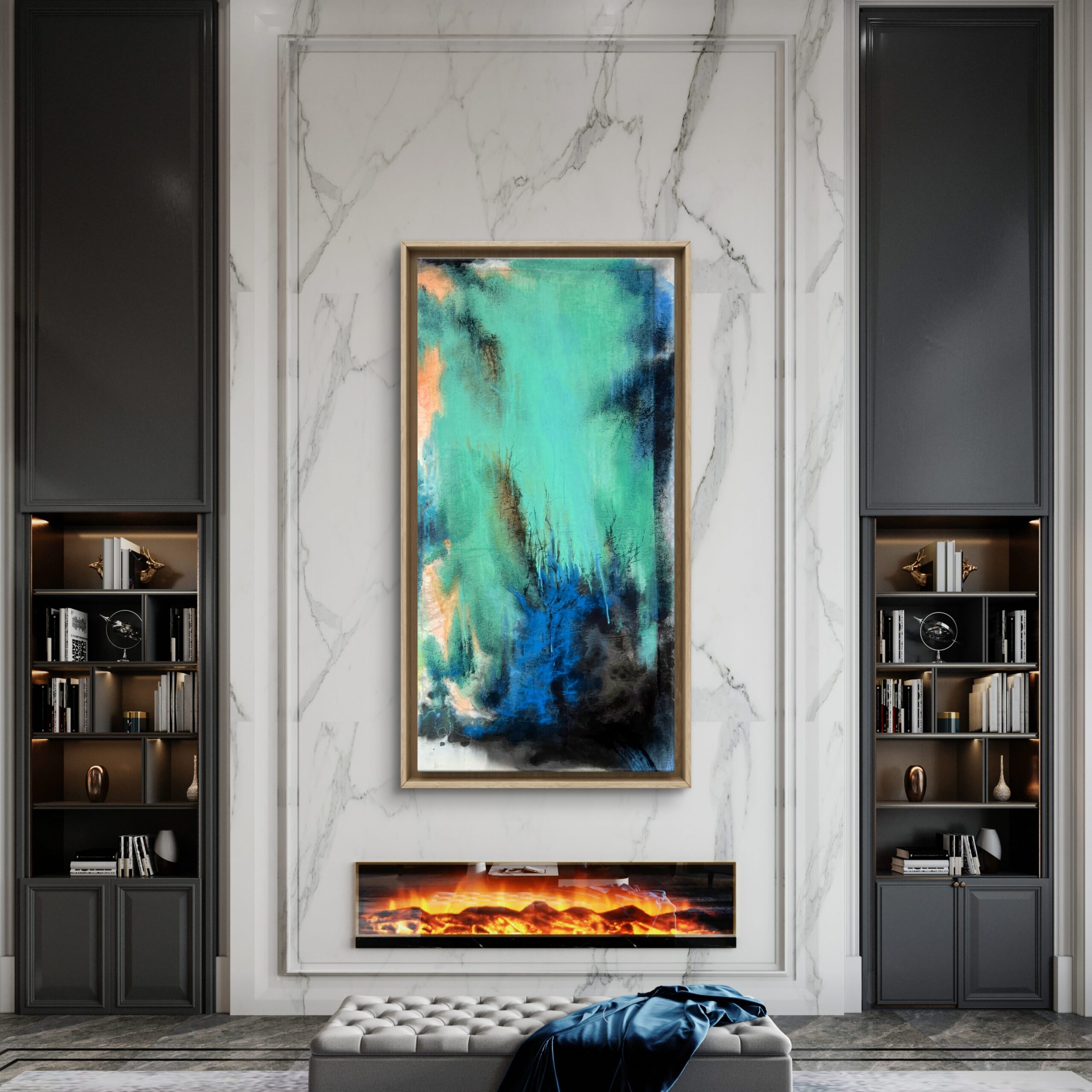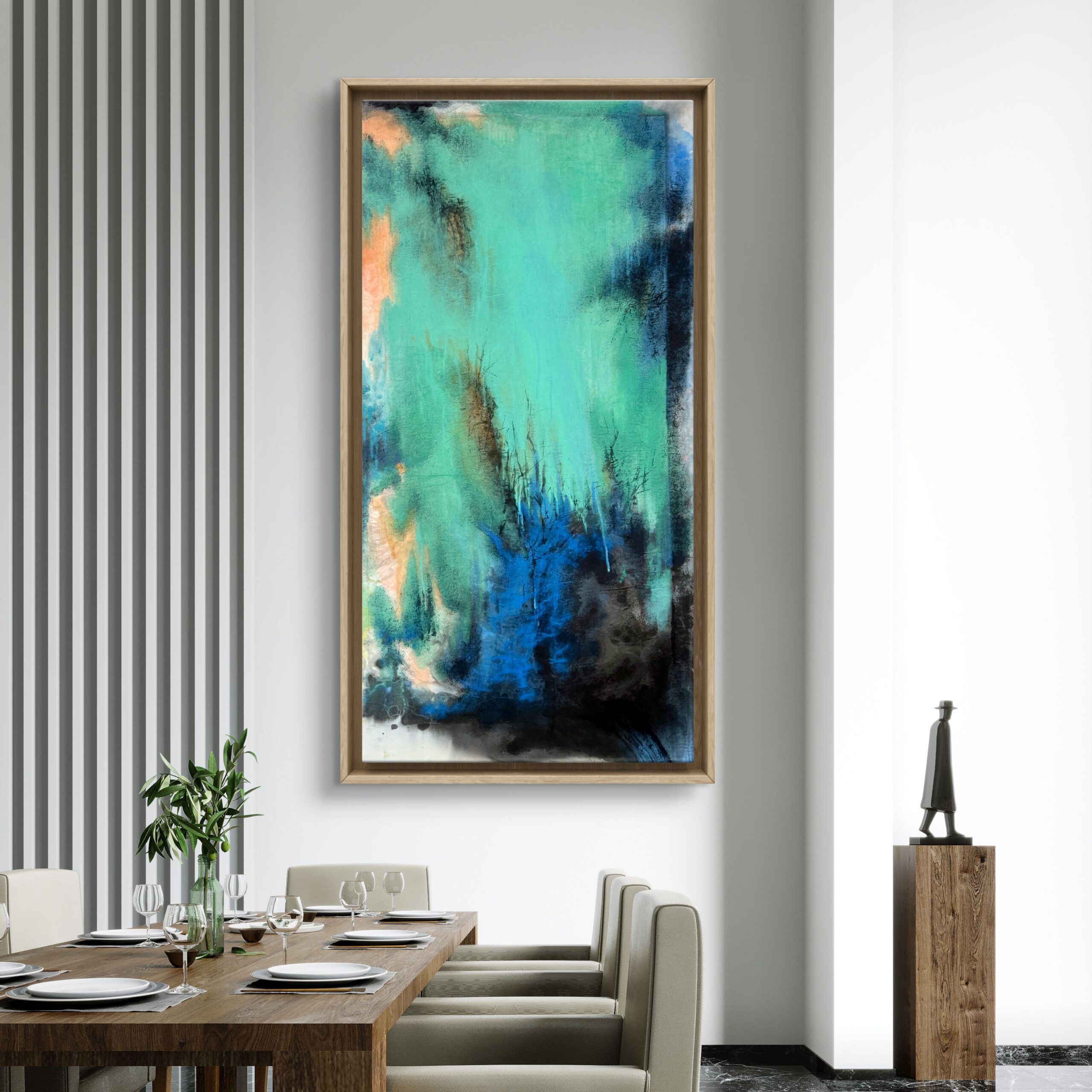 This vertical abstract work, The Primeval Verdure, is a powerful meditation on the emergence of life from chaos. It captures the moment of creation where the primordial darkness yields to the vibrant, life-giving force of nature, symbolized by the cascading turquoise and blue.