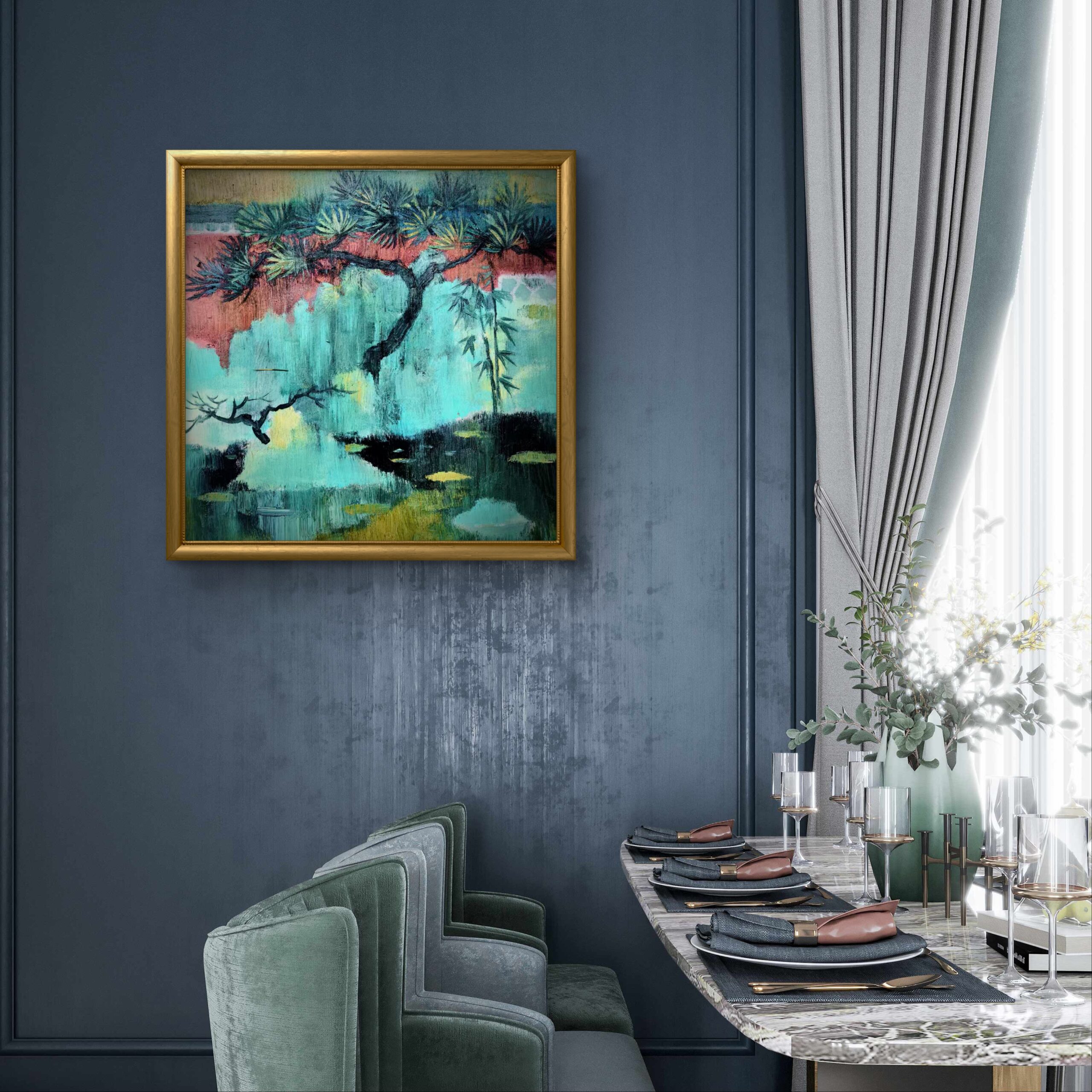 #abstract landscape #expressionistic pond #texture oil painting #turquoise and red #zen garden #meditative and calm # dreamlike scenery