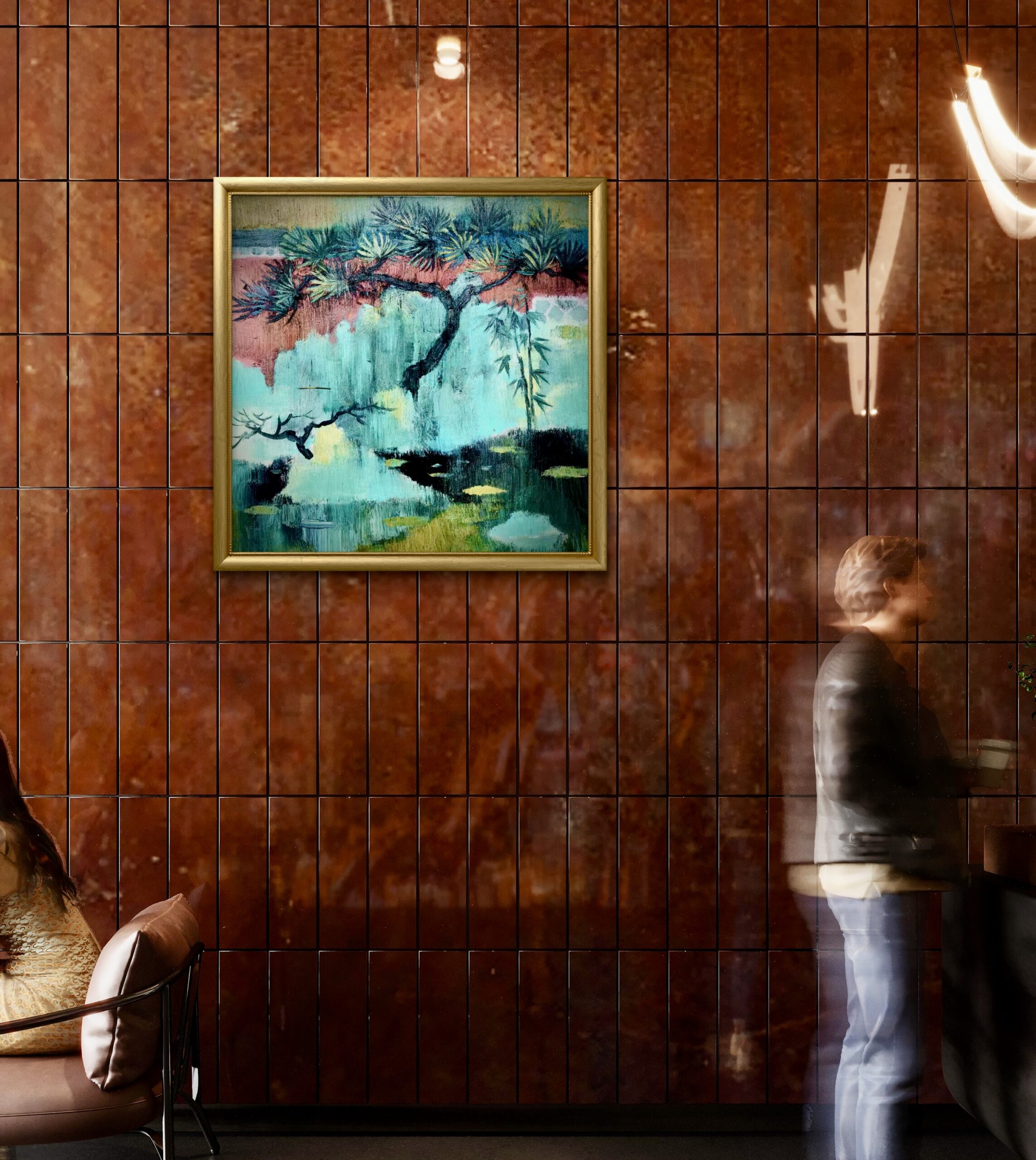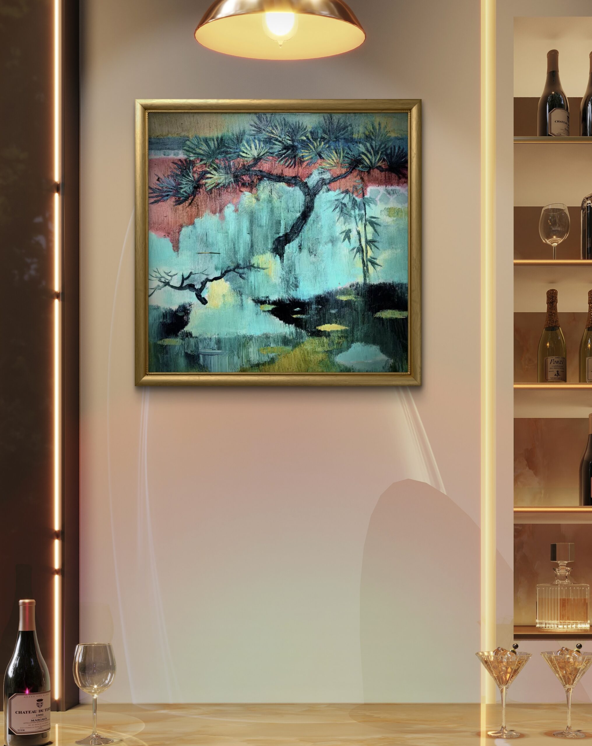The mood is set by a vast expanse of turquoise and cyan—the color of water, air, and dreams. It’s mottled, not clear, because memory is never high-definition. Upon this haze, I inscribed Eastern symbols. The pine tree is outlined in black, a relief sculpture of thick oil paint. Beneath it, a warm ochre patch—a sunset’s afterglow—balances the cool water.